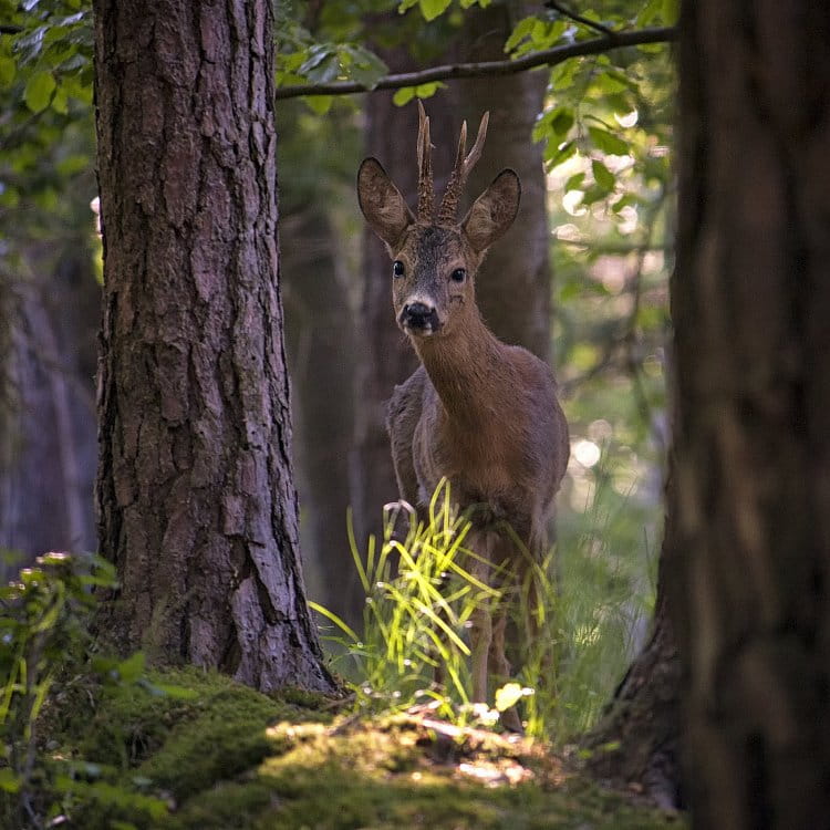 - Popis fotografie: 13.05.2018; Louky se s prvními slunečními paprsky vyprázdnily a tak jsem zatáhnul do lesa, stejně jako zvěř. A tam stál on. V přírodním rámu borovic, krasavec s operleným parožím.