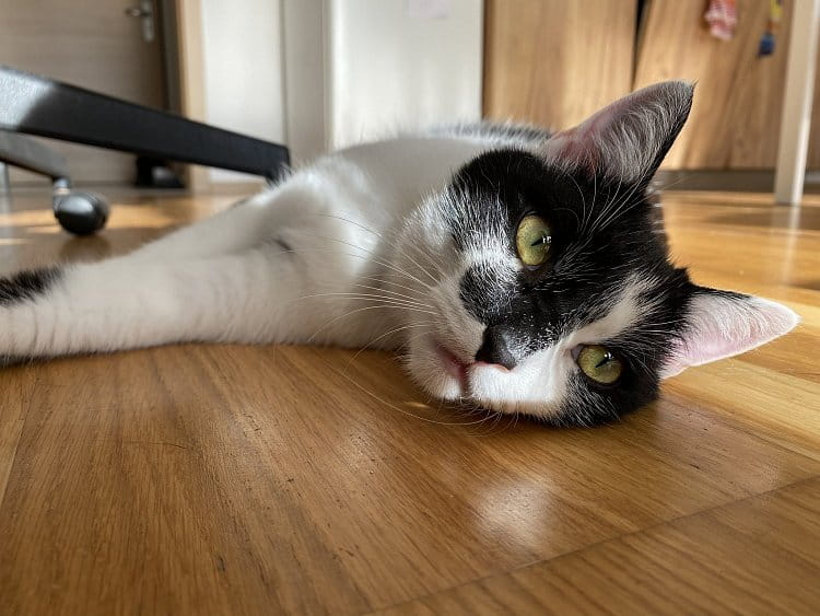 Fotka vznikla 6.11.2021, když jsem šla kamarádce nakrmit kocourka, pana Mickyho. Na fotce odpočívá a tráví snídani.