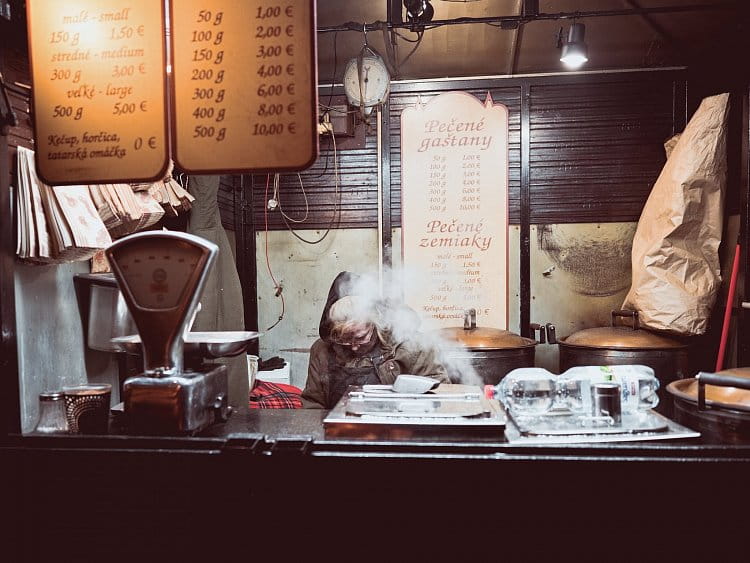 - Popis fotografie: 12.12.2022 Bratislava vánoční trhy a po dlouhém dni unavená prodejkyně pečených kaštanů