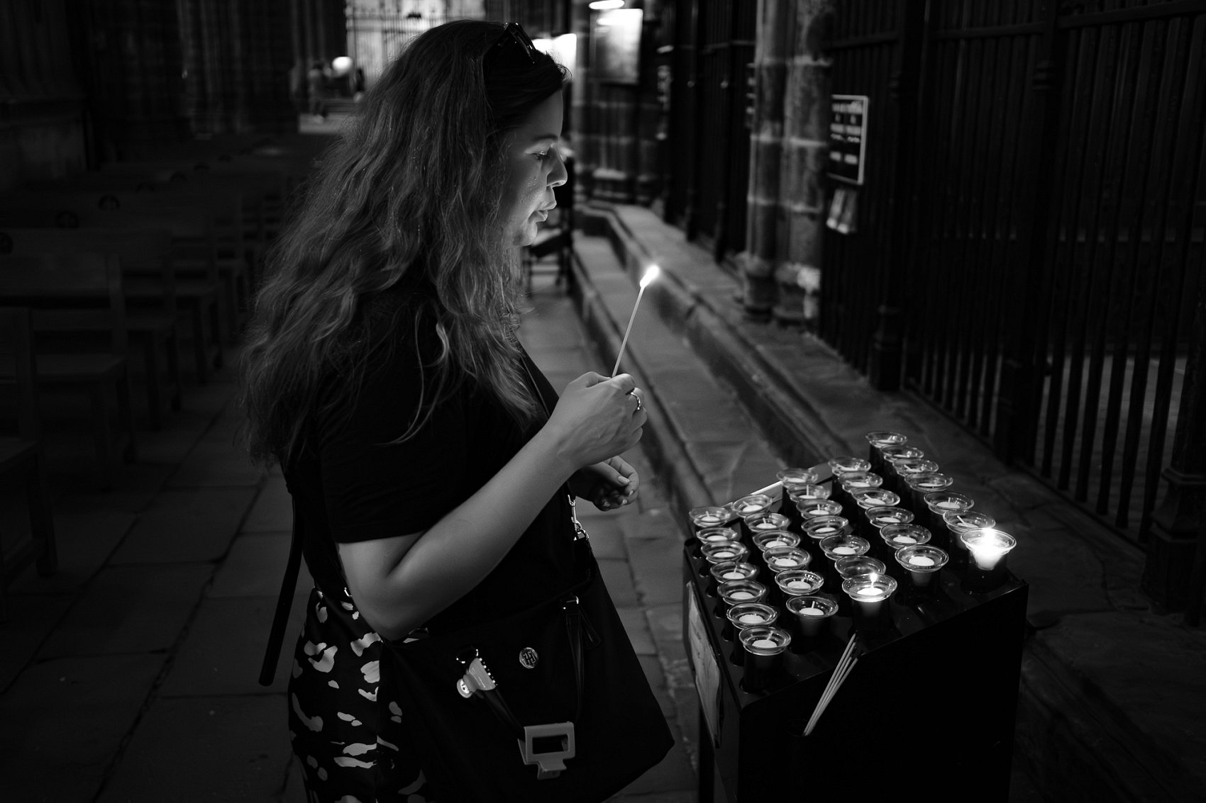 - Popis fotografie: Fotka vznikla během pracovní cesty do Barcelony, kde jsem kolegyni vyfotila při návštěvy katedrály a zapalování svíčky za někoho... Bylo to v září 2024.