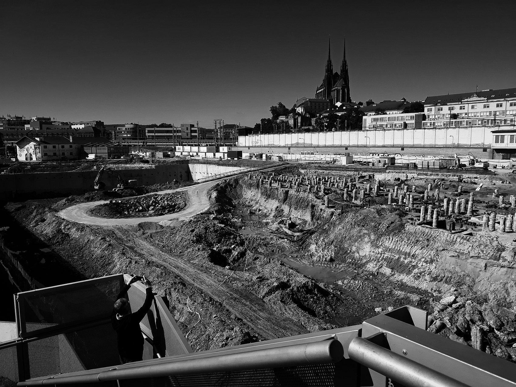 - Popis fotografie: (3. října 2025) Během cesty na brněnské autobusové nádraží se mi naskytl fascinující pohled na zbytky obchodního domu Prior, kterým v pozadí vévodí starobylá katedrála svatých Petra a Pavla.