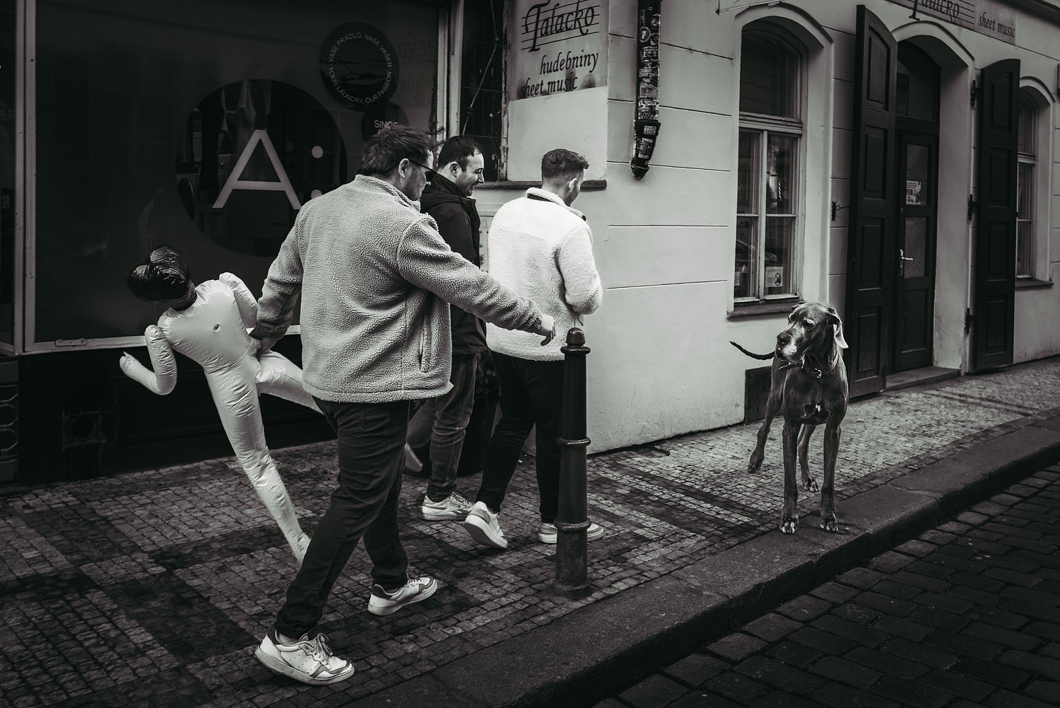 - Popis fotografie: 5.3.2026. Šel jsem Dlouhou ulicí a zahlédl jsem třei cizince, z nichž jeden nesl nafukovací pannu, což mě zaujalo, vydal jsem se za nimi a fotil je. Najednou k nim přiběhla velká doga a vyjeveně civěla na tu pannu...