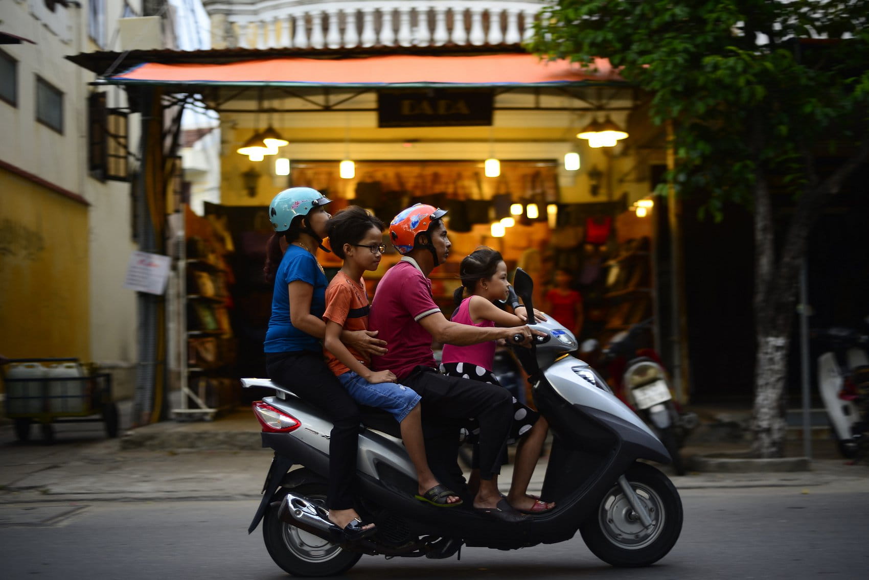 - Popis fotografie: 1.9.2016, Vietnam, na ulici, dospělý s helmou, děti ji mít nemusí